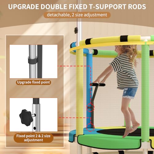 Trampoline for Kids, Update T-handrail Adjustable Baby Toddler Trampoline with Basketball Hoop, 440lbs Anti-Rollover Round Bottom Indoor Outdoor Toddler Trampoline with Enclosure