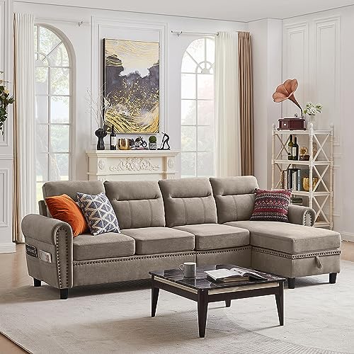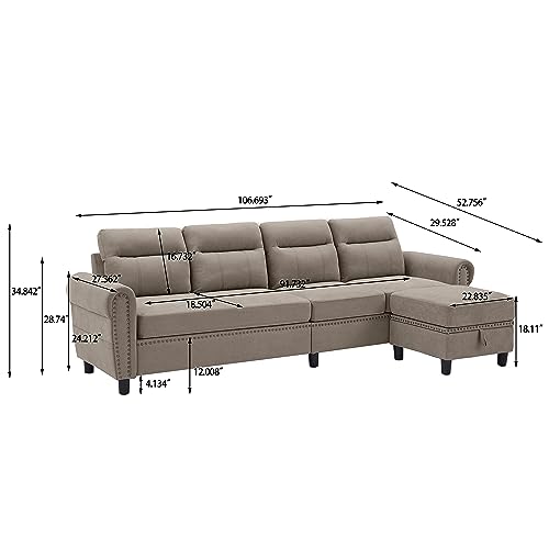 106″ Convertible Sectional Sofa, L Shaped Couch with Storage Chaise and Side Pocket, Modern Reversible 4 Seater Couch for Living Room, Apartment, Office, Beige