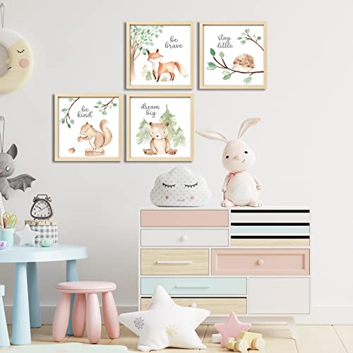 ArtbyHannah 4 Pack Framed Funny Woodland Baby Nursery Wall Art Decor with 10×10 Wood Frames and Cute Safari Animals Prints for Kids Playroom Decoration, Light-Wood