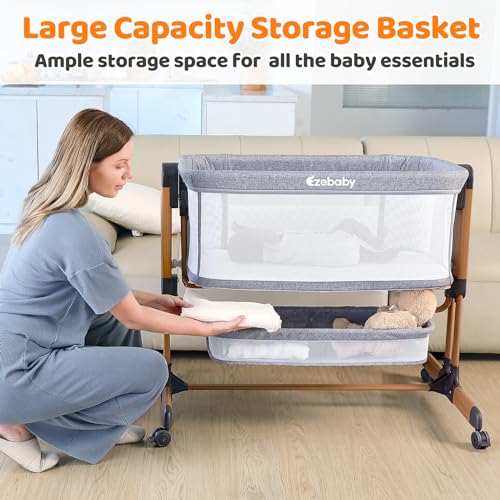 Ezebaby Baby Bassinet, Rocking Bassinet for Baby, Bedside Bassinet with Wheels,Storage Basket,Adjustable 7 Heights and All Mesh Sides, Portable Baby Bassinets Bedside Sleeper for Newborn Infant