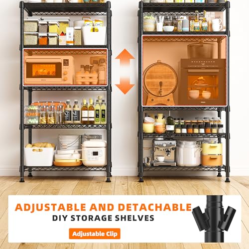 【Upgraded High-quality & Super Stable Shelving Units】Our metal shelving undergone special coating treatment, giving excellent rust resistance and oxidation resistance, it is approved for commercial kitchen use. Besides wire shelves equiped anti-tipping devices, ensuring the stability of the overall structure, so that you can use more safe and assured.