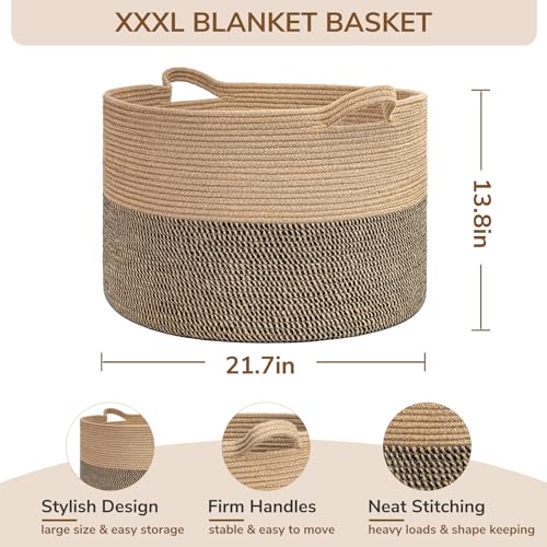 TIMEYARD Blanket Basket, Large Baskets for Storage, Toy Baskets Storage Kids, 21.7” x 13.8” Cotton Rope Basket for Living Room, Wicker Baskets for Organizing, 90L, Black & Jute