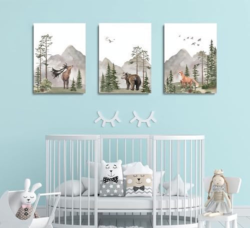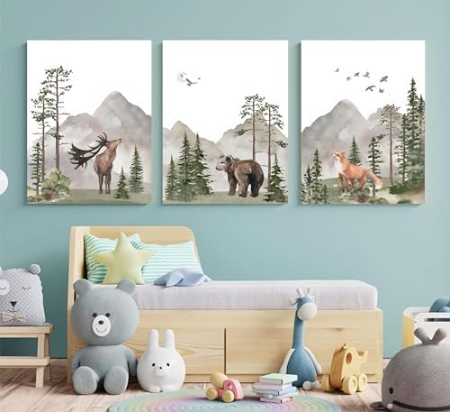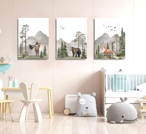 YBARTZQ Woodland Nursery Wall Art Wild Animals Forest Wall Decor Prints Adventure Theme Canvas Posters Deer Bear Fox Watercolor Pictures Paintings for Boys Room Girls Room 3Pcs 12x16in Unframed